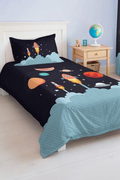 Bu tek kişilik pike takımı, çocuk ve genç odası dekorasyonunu tamamlayarak hem görsel zevk hem de konfor sunar. Uzay teması ile uyku zamanı çok daha eğlenceli bir hale gelir.